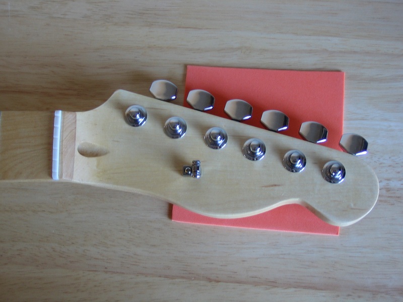 The neck was bought pre-fretted with a padel headstock. I’ve cut it to into a Telecaster headstock shape, except I was copying from a printout and didn’t get the top curve quite right (and it’s a touch wider than it should be) – so it’s “unique”.