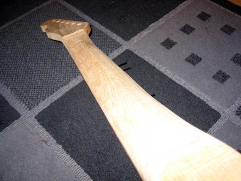 I was about to write I’d never used a spokeshave, but that goes for every tool so far on this little voyage (well beyond a drill and a screwdriver). It didn’t take too long to start to look like the back of a guitar neck. I started by using my little plane to remove the saw marks, then onto the spokeshave. It’s a poor quality photo, but you can see the neck is fairly uneven, a fair amount more work to do.