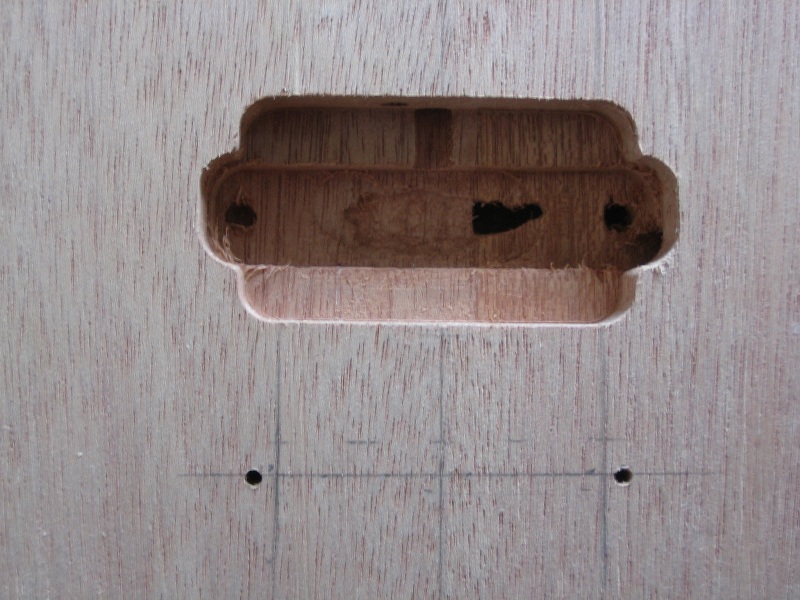 While cutting the EMG81’s cable channel the dremel (which I was using for test cuts) dropped into a void in the wood (the middle one hole, left and right are the screw holes). It’s quite deep and now fairly full of sawdust from the pickup hole. Guess it adds character…..