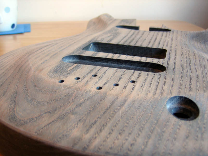 Sanding the front and back was relatively quick, the sides and inside of the horns took a long time. Still a bit more work to do on the sides before it’s ready for the blue coat. A spindle sander seems more attractive the more I work on guitars……….