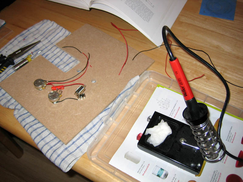 I decided it was time to start the electrics for the guitar. I drilled three holes of the correct size (10mm for the pots, 12mm for the switch), in same layout as the guitar, into a scrap piece of 6mm MDF. Using this I can cut all the wires to the correct length and it holds the components as you try to solder them. This shot is from about half way through, about to add the ground wires (and thus swapping to a bigger soldering iron). As a side note, while drilling the holes, it did remind me that I want to get some more of the Colt drill bits, as they are superb for the money.