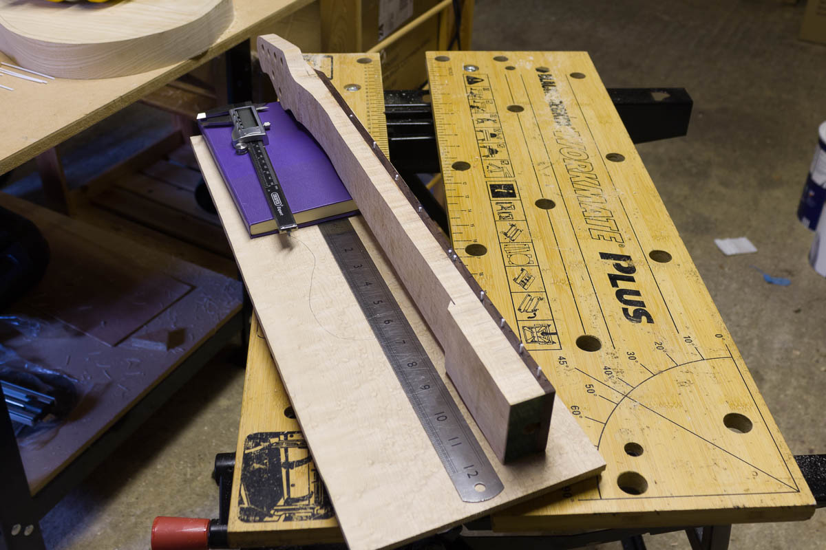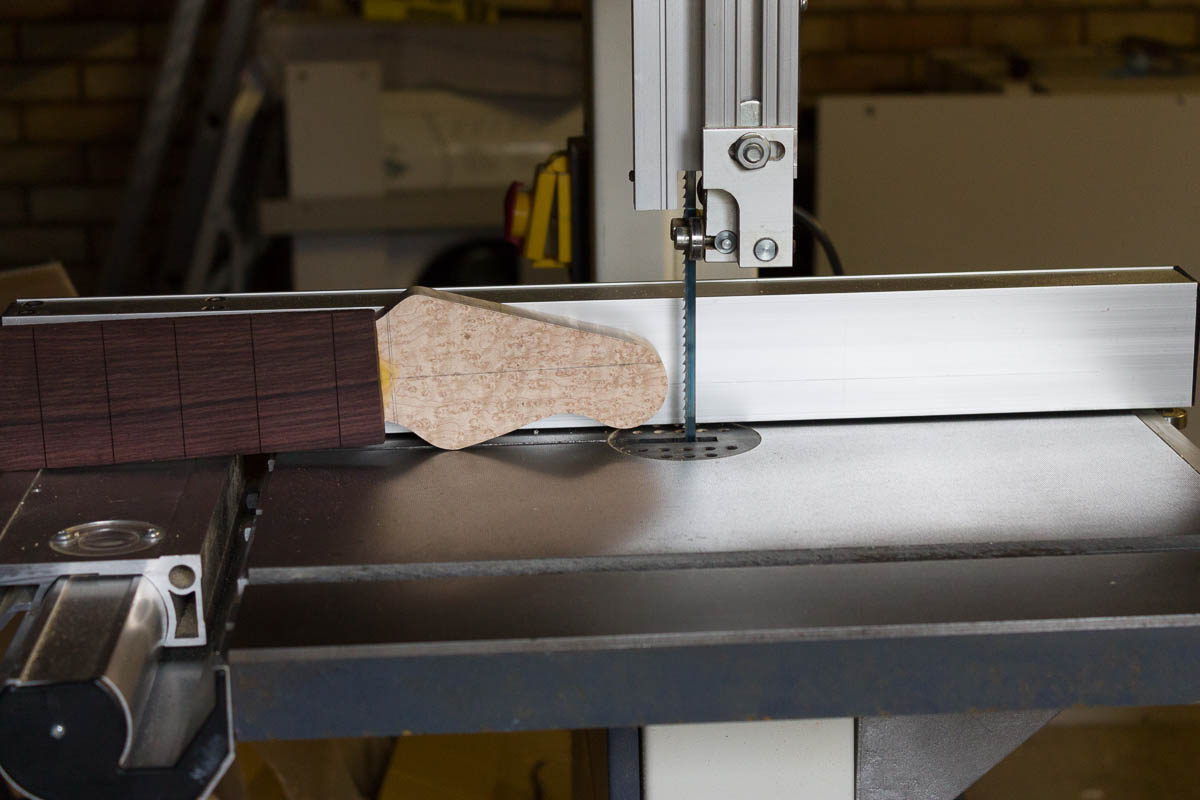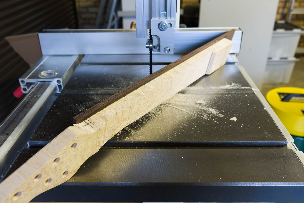 - Rough cut the back of neck to 24-25mm thickness, to speed up shaping. Target is 22mm at the nut and 24mm at the 12th (to copy my favourite neck dimensions from the Axis Super Sport)