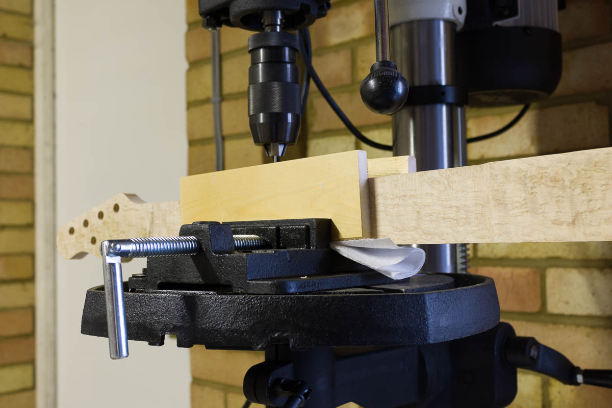 - Drill side dots – 2mm bit. I should of done this before cutting down the back of the neck, instead I forgot. First time using a clamp on this drill press, wasn’t perfect, however I can see with practice it could be a lot more accurate than my last drill setup. I drilled them in the middle of each fret, height and width wise. I need to get more light sorted out over the drill press, as that was one of the main issues with checking alignment