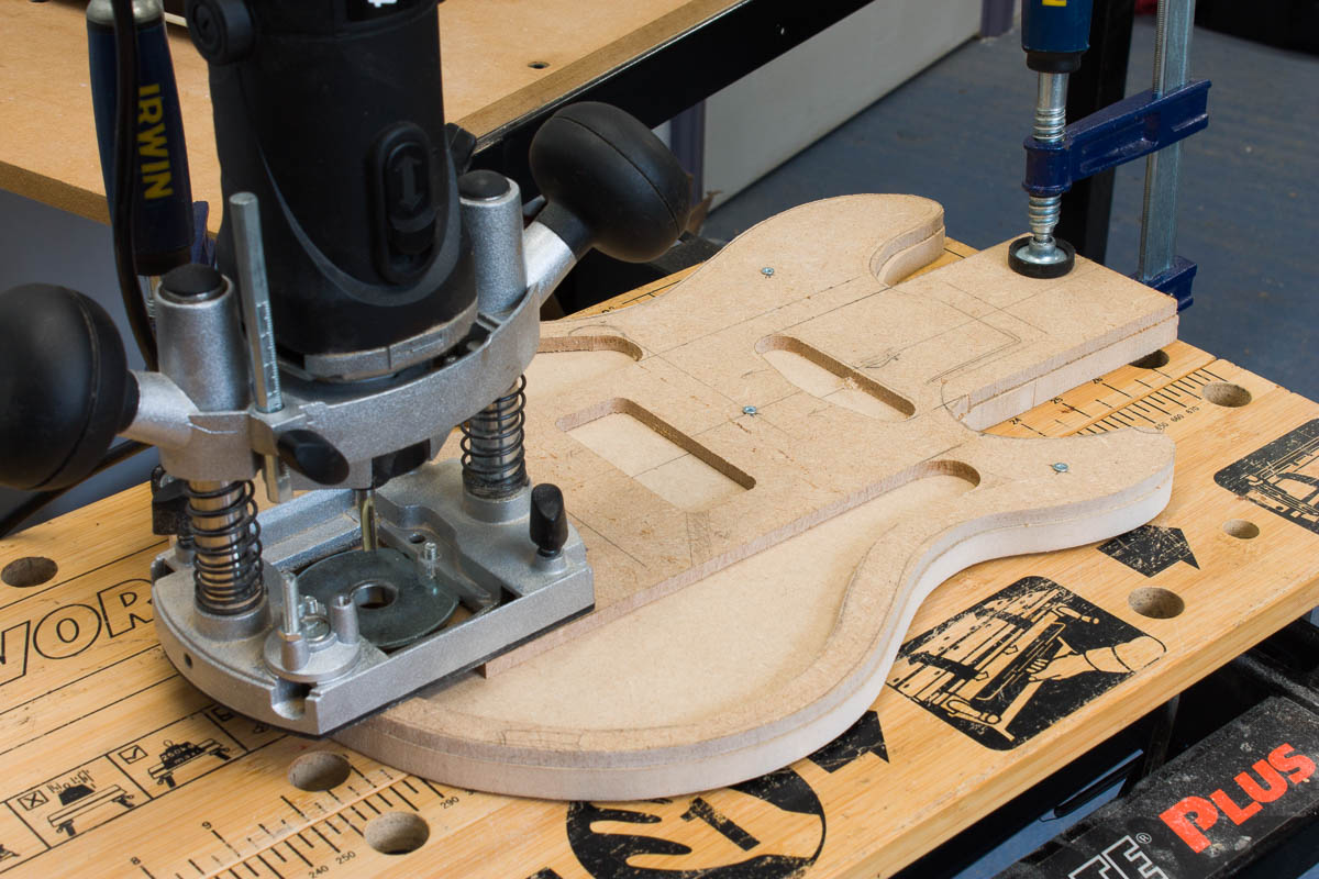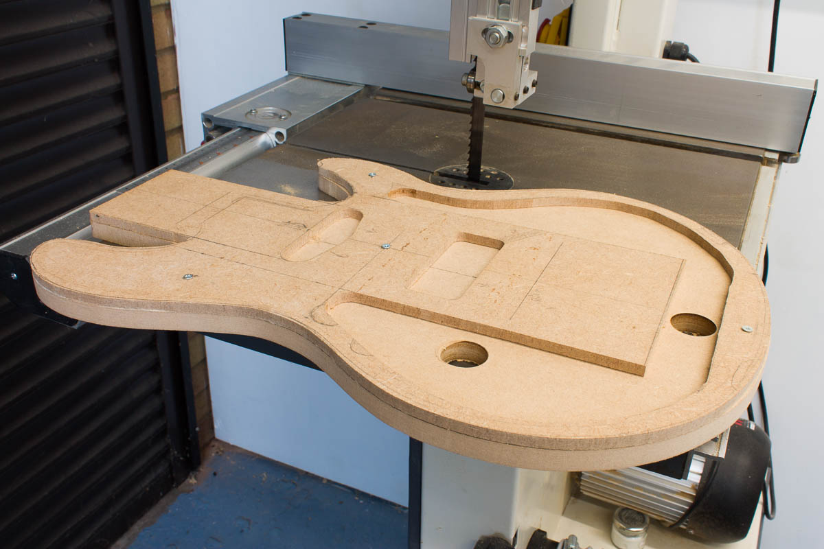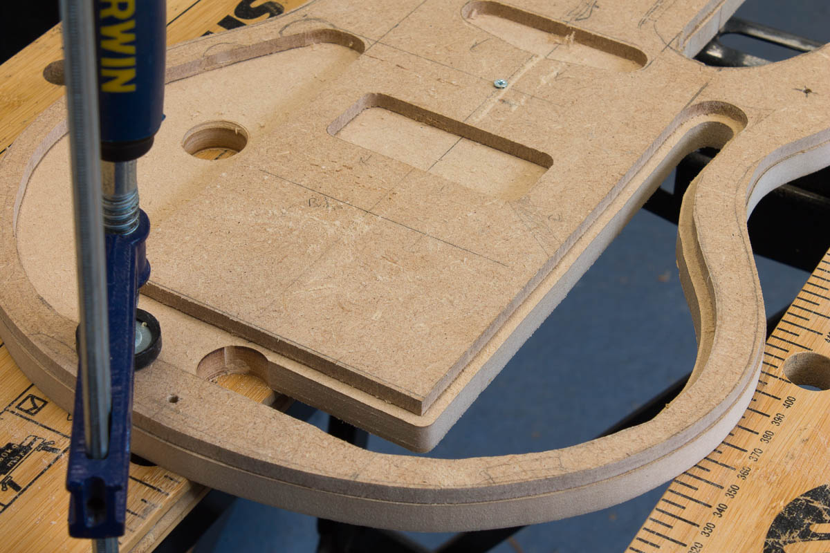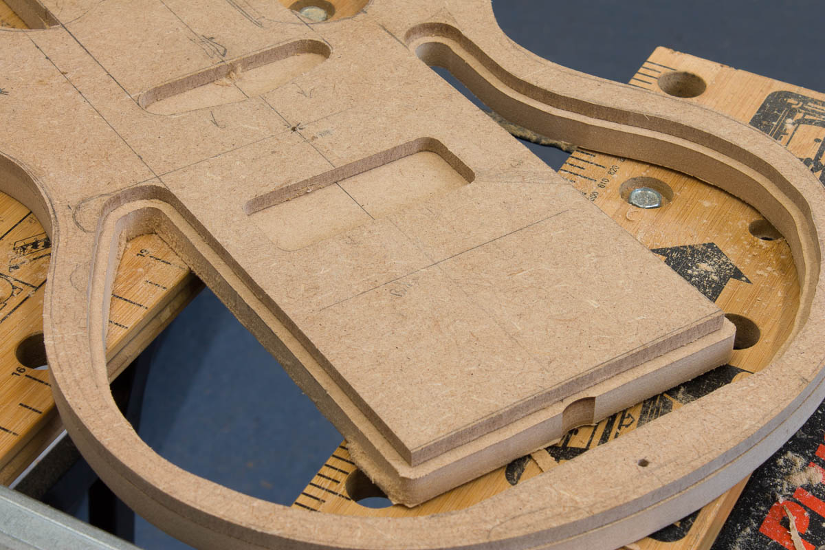 A year and a bit ago, while drilling out the wood for the sound chamber, I drilled way to far out (which was part of the reason I put the guitar build away). Reverting to what I know, time to put together a MDF template to see if I can get a shape that will work. I tried free hand routing the internal curve, which as you can see if a bit of a mess (the top 6mm MDF template). Instead I’ve copied it to a 12mm MDF template without an offet, I’ll use the spindle sander to sand a more natural flow. The flat edges are fine, so I’ll take them to the same line as the 6mm one. None of this would be visible, but I would know……