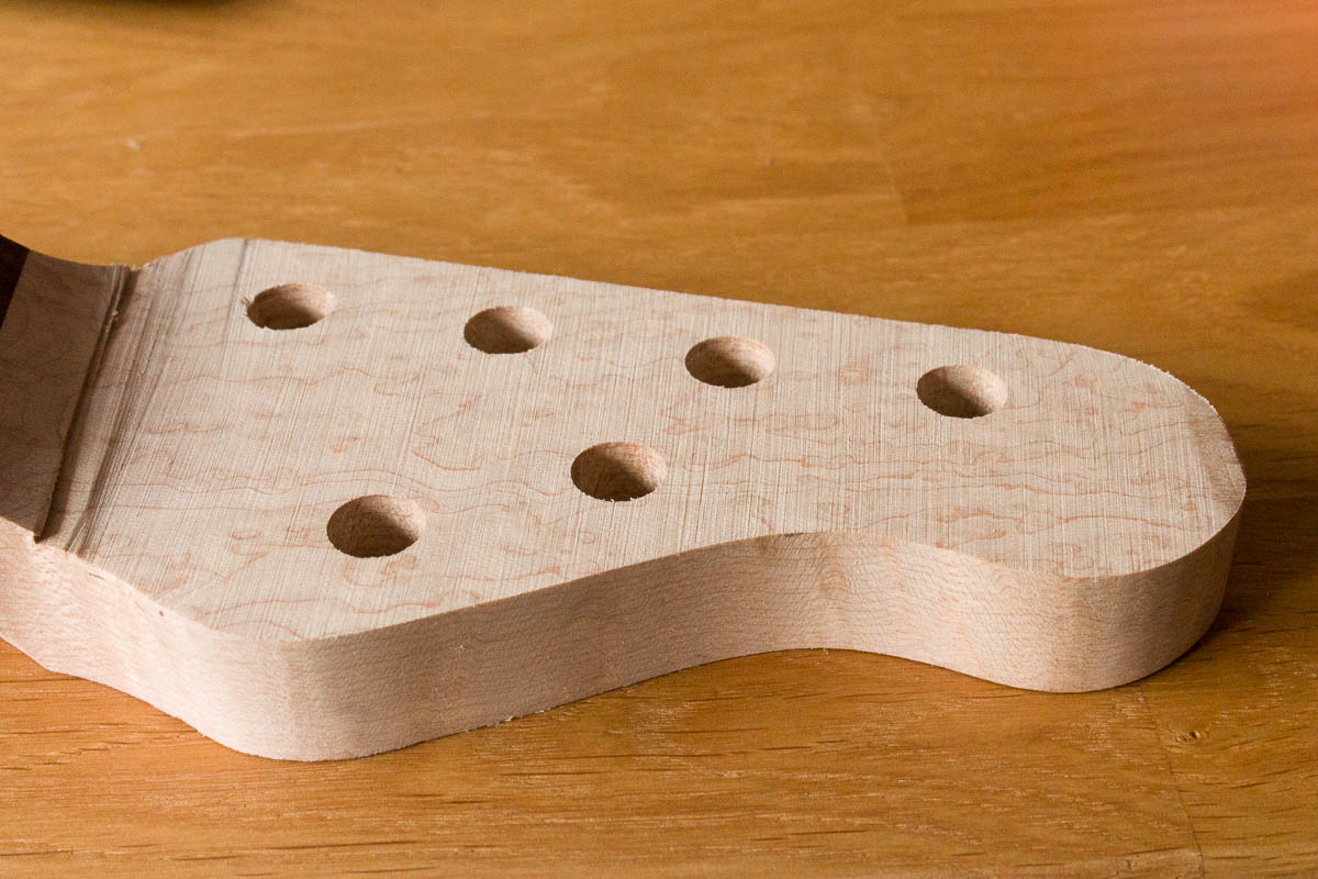 The head stock is too thick as I cut it (and it isn’t a consistent depth, it gets fatter towards the nut). Bird’s eye maple has turned out to be a real pain to cut so far, as you can see the band saw blade wandered at the very beginning. I tried clamping the belt sander to the desk and starting to true it up using that. I originally aimed for a 16mm thick headstock, now the plan is to get the headstock to 15mm thickness, then sand it with an orbital sander to remove all the marks (as you can see, the belt sander has left the harsh grit lines you would expect). This should be the minimum I need to loose to get rid of the mark at the top of the headstock.