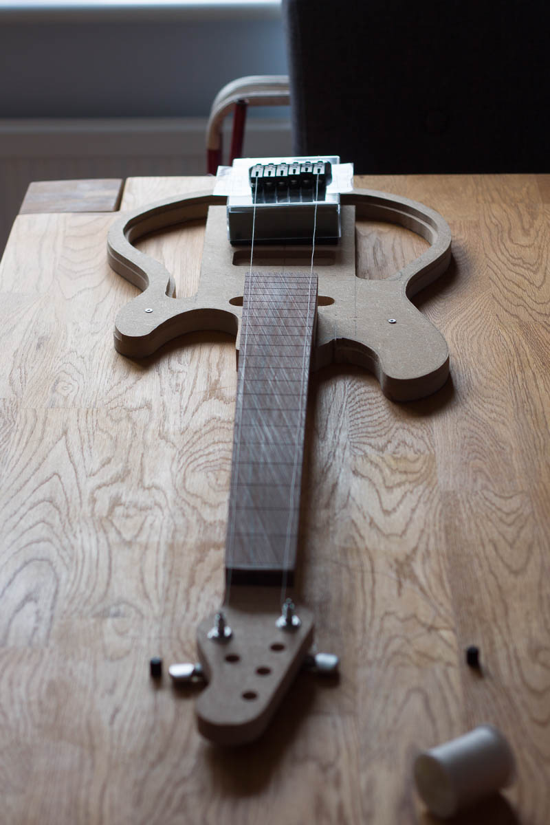 After getting burned before on neck dimensions, I decided now was a good time to check that the bridge string spacing and neck work together. It’s a really rough layout check, however it’s a good point to find any issues before the neck pocket is cut.