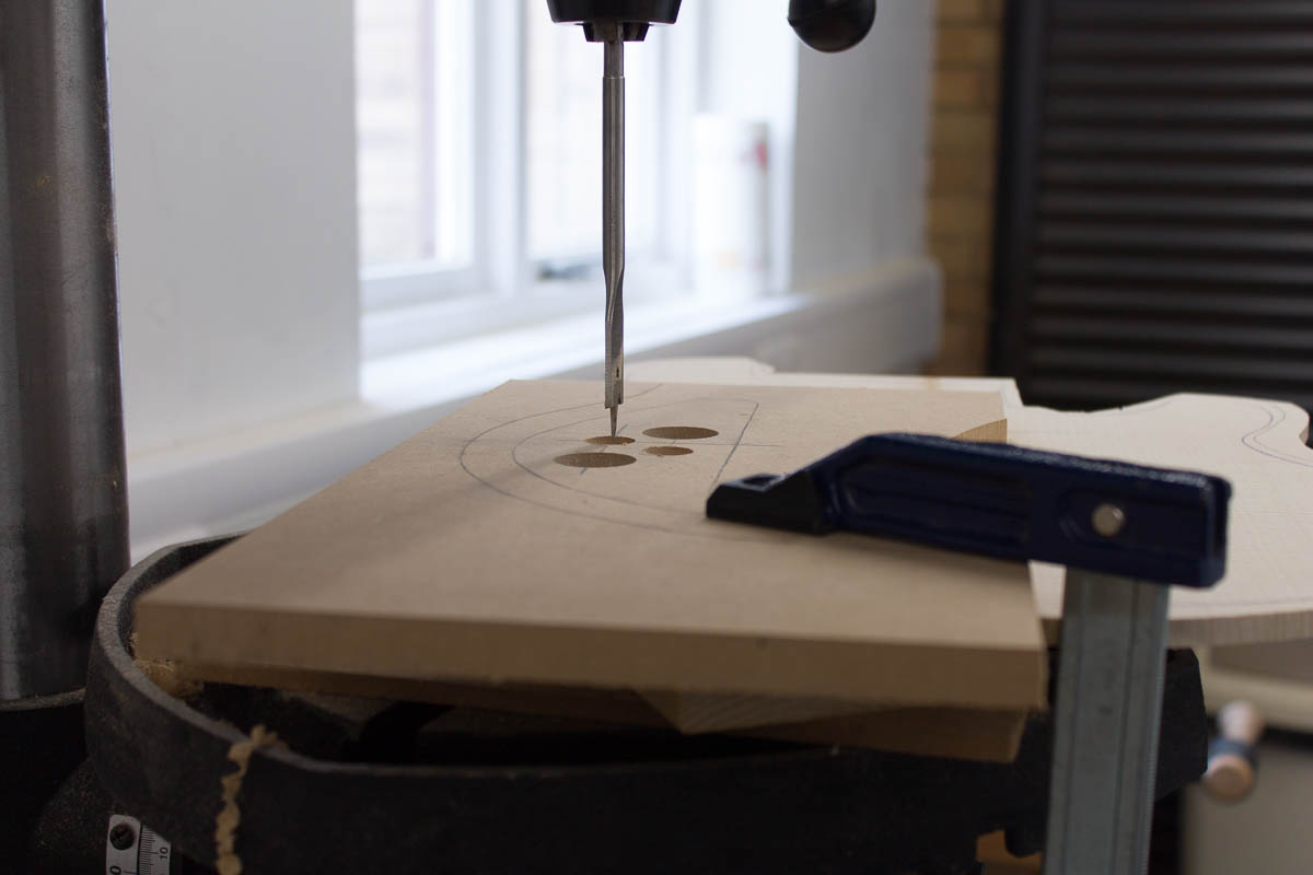 To ensure I got the pattern I wanted, I quickly made a template in MDF. The small holes are a 16mm spade bit and the larger holes a 25mm forstner bit. The hole is drilled at this stage to allow for the back of it to be supported (reducing the chances of splitting the back). Thankfully I was looking at another build blog, or I may have skipped this stage before I glued it on.
