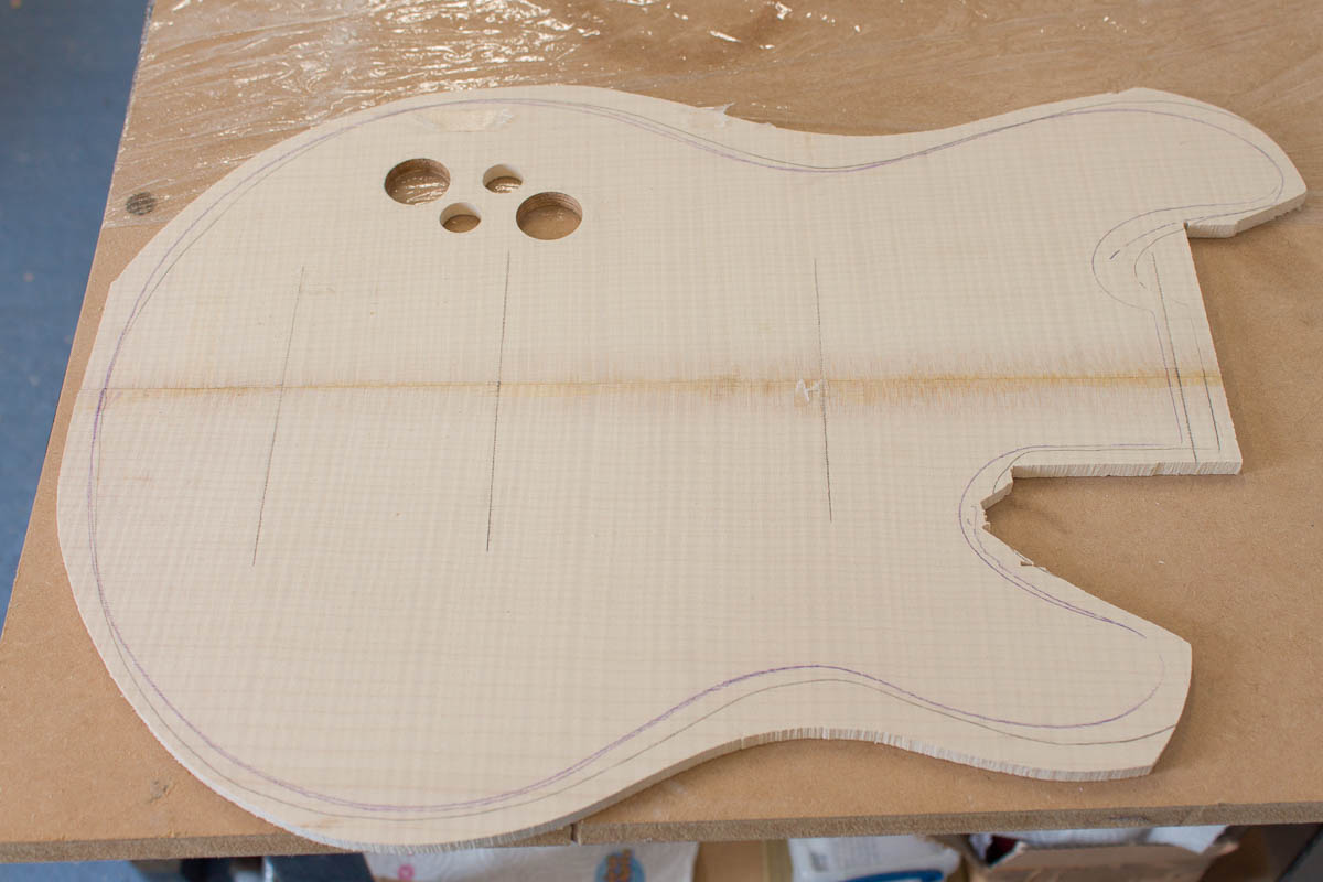 Semi hollow guitars normally use the “F-holes” seen on violins, cellos and arch top guitars. Instead, as previously mentioned, I’ve gone for something a bit more modern (and simple to do). I designed a pattern of holes using coins while sat in front of the TV…..
