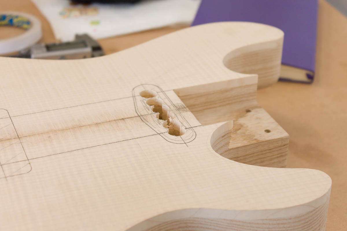 The bridge pickup route is more trouble. My template router bit is too long to cut the route, so I had to cut it 2mm deeper than I needed (18mm instead of 16mm) and float the template 6mm above the body – which makes precise alignment all the harder.