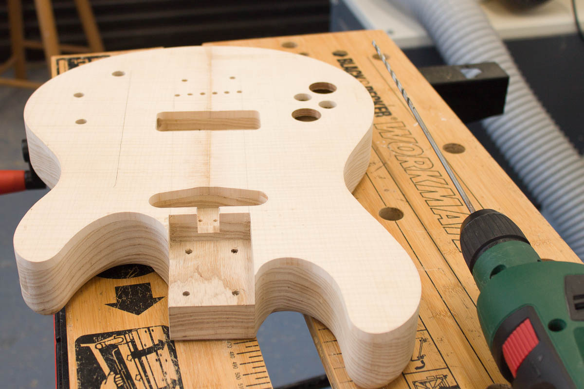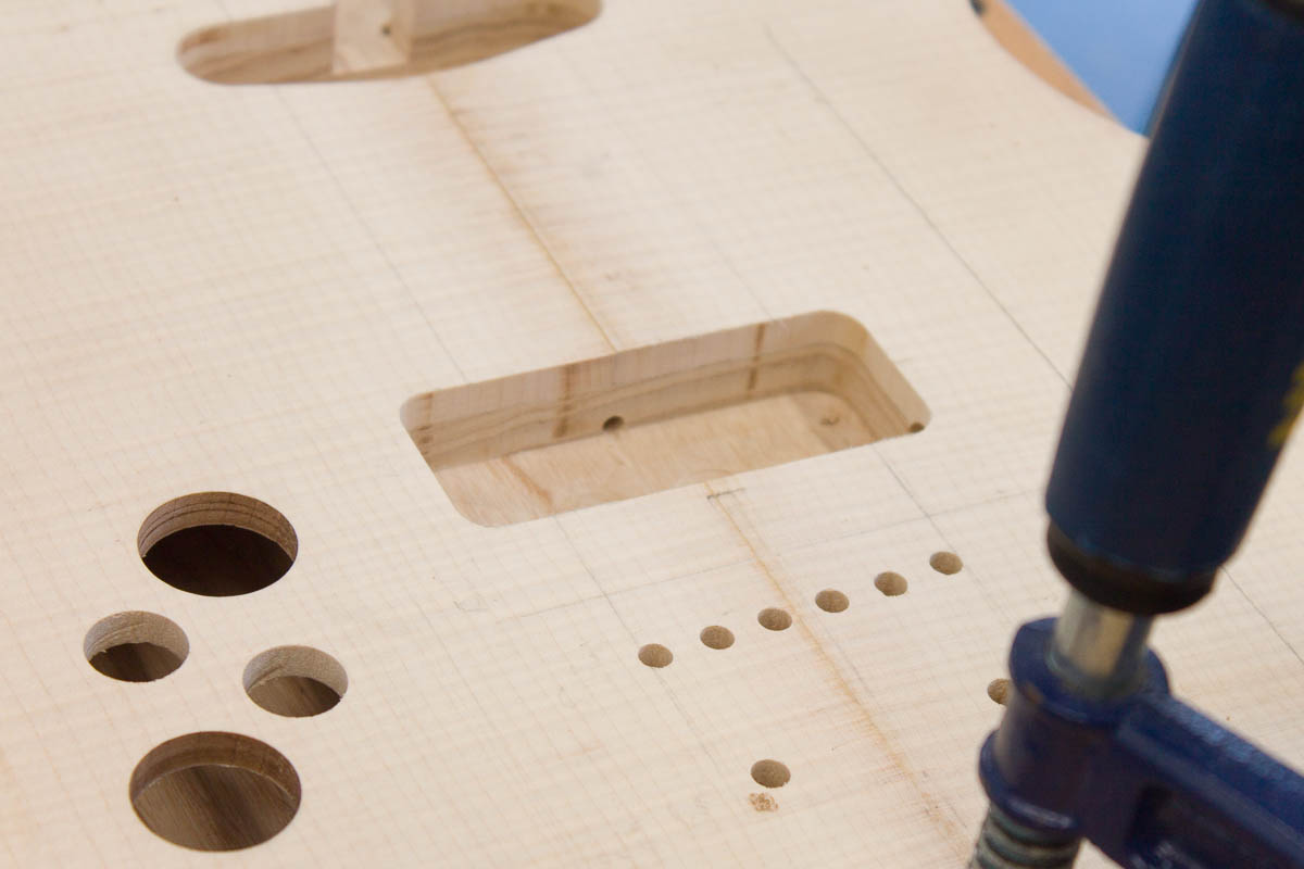 With the centre line of the top and the trussrod access cutout, I had some strong visual clues to help the drilling. I started at the neck pickup route in the centre.