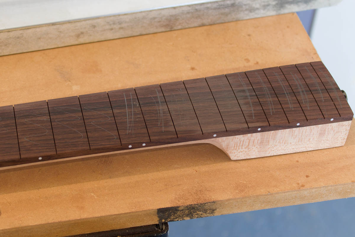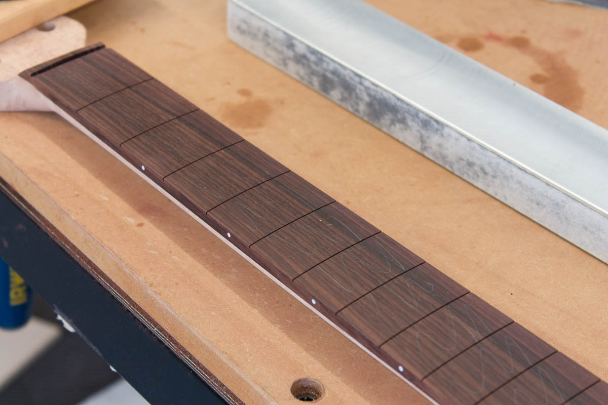I used an iterative approach of moving between flattening the fretbaord and radiusing the board. Using pencil marks to find the high spots, I worked until the fretboard was flat along it’s length with the correct curvature across. Interestingly you can see the high spots are at two defined points.
