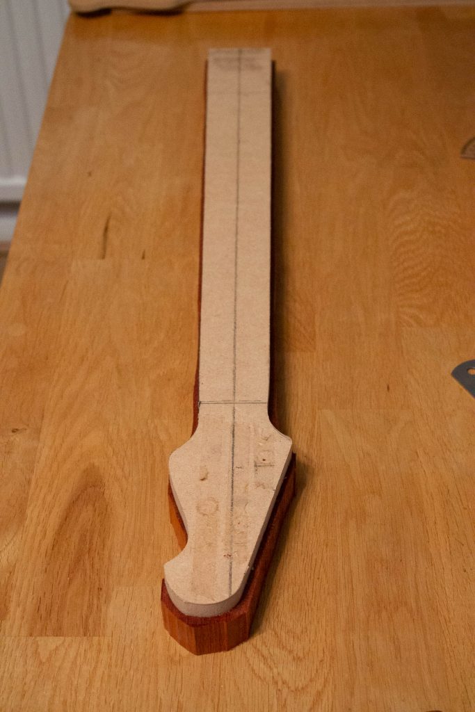 Attempt number 1 of building a 12mm MDF template from the CNC headstock template. You can see there is an awkward transition around the nut.